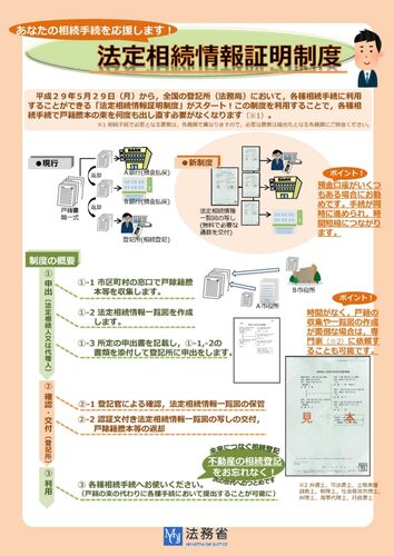 こんにちは、福岡県久留米市のおちいし司法書士事務所 落石憲是です。 きょう、平成29年5月29日(月曜)より、法務局において、各種相続手続きに利用することができる「法定相続情報証明制度」が始まりました。 ↑ 法務局ホームページより (1)法定相続情報制…